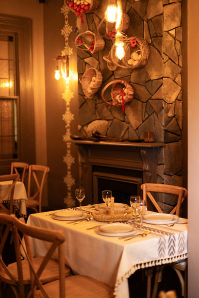 The restaurant combines a cosy, homelike feeling with Ukrainian decorative elements. From wood accents to embroidered patterns and fireplace seating, every detail reflects a blend of comfort and tradition. Our guests are welcomed with a friendly family-run atmosphere, staying true to the roots of Ukrainian dining.