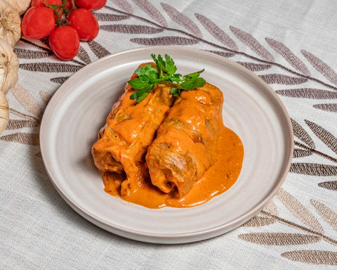 Cabbage leaves filled with pork and rice, baked in a creamy tomato sauce – comforting and hearty